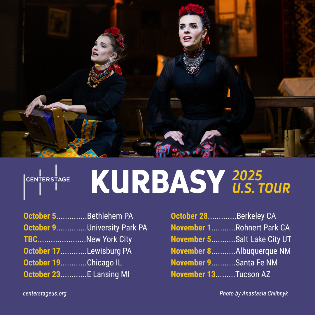 Kurbasy is traveling the U.S. as part of Center Stage, a cultural diplomacy program that also produced the group in 2018. The seven-week tour features residencies in 11 communities: Bethlehem, State College and Lewisburg PA, New York City NY, Chicago IL, East Lansing MI, Berkeley and Rohnert Park CA, Salt Lake City UT, Albuquerque and Santa Fe NM, and Tucson AZ.